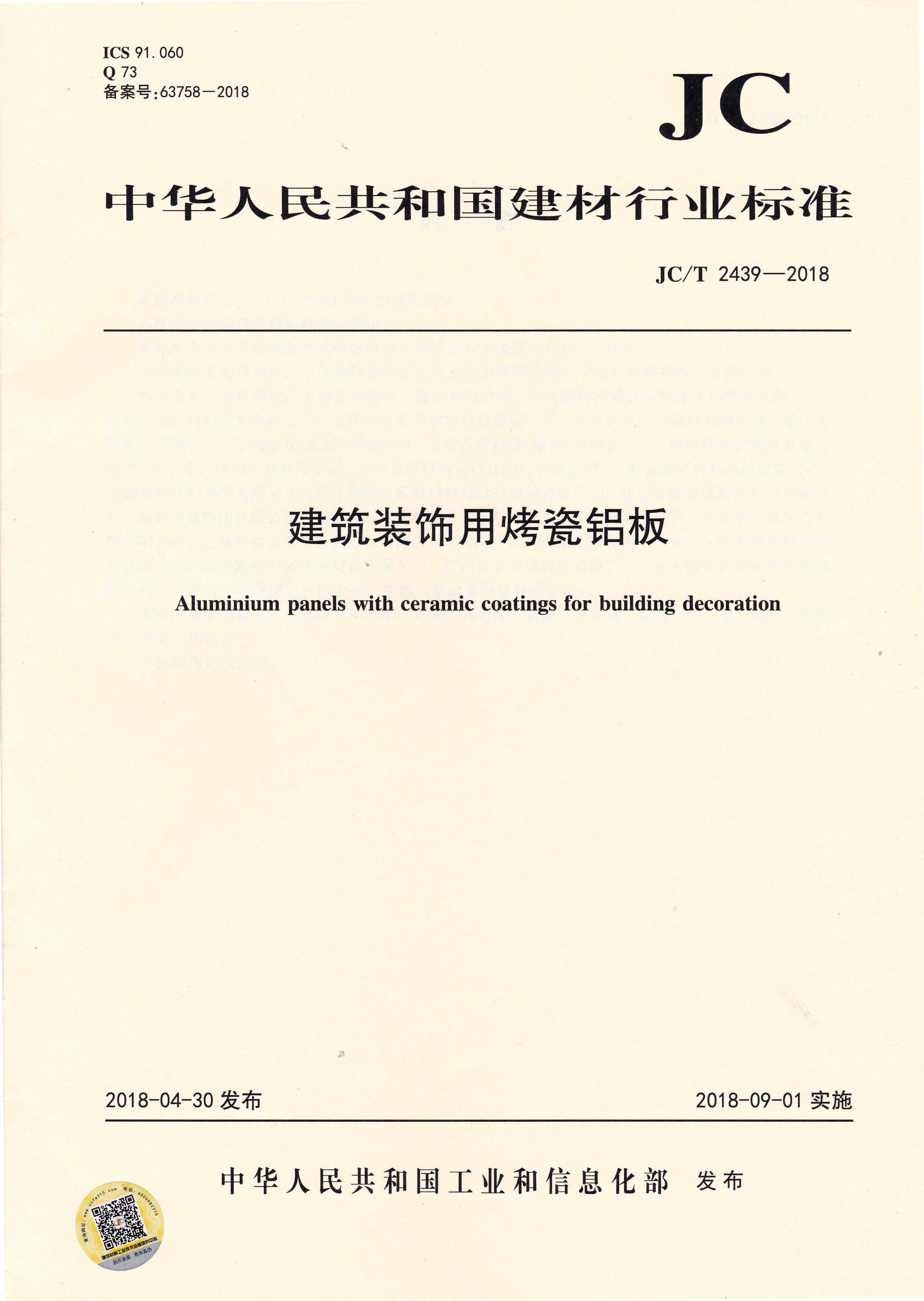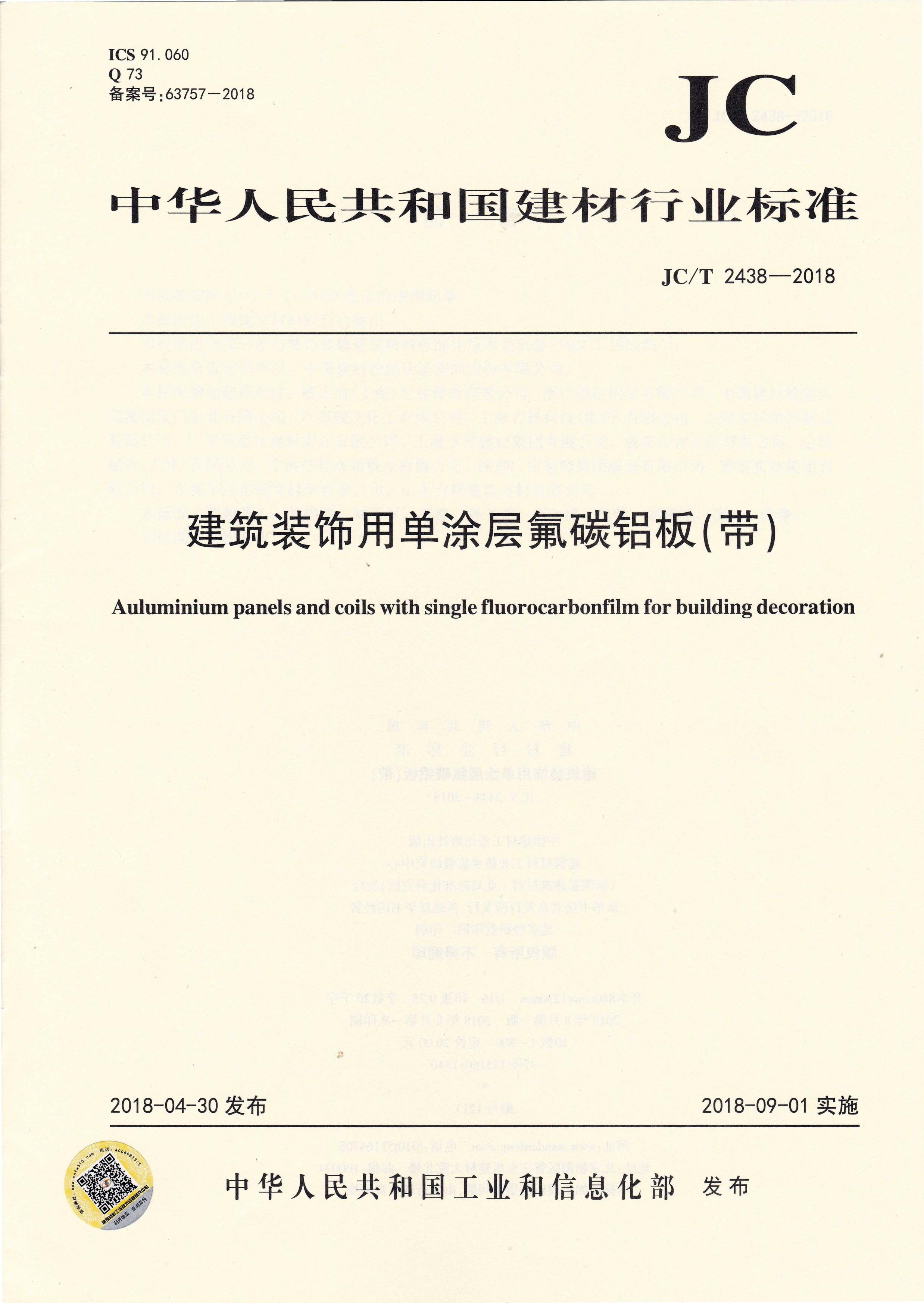 近日,由中國建筑材料聯(lián)合會提出,雅泰實(shí)業(yè)集團(tuán)有限公司參與起草的JC/T 2439-2018《建筑裝飾用烤瓷鋁板》、JC/T 2438-2018《建筑裝飾用單涂層氟碳鋁板(帶)》兩項行業(yè)標(biāo)準(zhǔn)于2018年4月30日首次發(fā)布,2018年9月1日起正式實(shí)施。